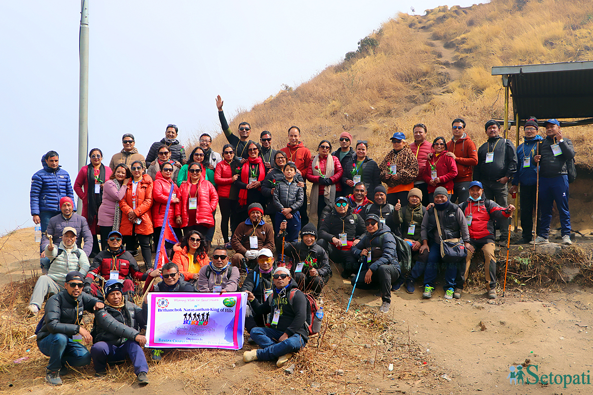 विहानी चिसो सिरेटोले हान्दै गर्दा तातो चिया लिने ठाँउमा हुलमुल नै भयो।उसिनेको अण्डा, झोल तरकारी लिंदै त्यो दिनभरिको गतिविधि, नियमहरु, जिम्मेवारी सहितको कार्यक्रम खाका रिसोर्टमा भएको माईक स्पिकरबाट सबैलाई जानकारी गराईयो।त्यसपछिको ठाडो, घुमाउरो, साँघुरो, सल्लाघारी वनको बाटोमा धुलो उडाउँदै गाडीहरुले रफ्तार लिऐ।रिसोर्टबाट ३-४ कि.मि. माथि उक्लिसकेपछि फराकिलो बाटोको दायाँबायाँ धेरै मोटरसाइकलहरु रोकिराखेको स्थानमा हाम्रा गाडीहरु रोकिए।हाम्रो हाईकिङ्ग त्यहिबाट सुरु हुने भएकोले बनेपाबाट लिएर गएको स्याउ, सुन्तला, पानी २/२ बोटल लगायतका सामानहरु सबैले पछाडी भिर्ने झोलामा राखि नेपालको झण्डा अघि फहराउँदै टोली स्फुर्तिका साथ हिंड्न तम्सियो।