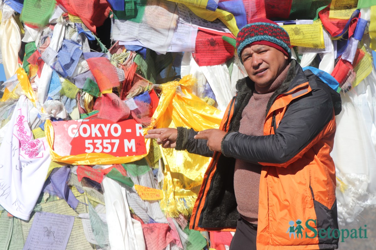 त्यहिमाथि बाहिरी पर्यटकहरूको धेरै आवतजावत हुने क्षेत्र भएको हुँदा हामीले सोचेको जस्तो मसालादार खाना खान पाइन्थेन, खाएका सबैकुरा अल्नो लाग्थ्यो। मोछेर्माेबाट तीन घण्टामा गोक्यो ताल पुग्न सकिने भएता पनि खाना खाएपछि हिँडाई सुस्त भएको थियो। हामी चार घण्टामा गोक्यो ताल पुग्यौं। नेटवर्क अनि नेटबाट बञ्चित भएर बस्नुपर्ने थियो। समुन्द्री सतहबाट ४८०० मिटरको उचाईमा बसेका थियौं। बिहानै उठेर ५३५७ उचाईमा गोक्यो रि पुग्नुपर्ने भएकाले बिहानको लागि तयारी गरेर छिटै आराम गर्याैं।