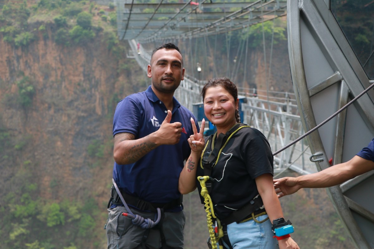 बञ्जी जम्प गर्दैगर्दा तल हामफालेर तल नपुग्दासम्म डोरीको महसुस हुँदैन। झुण्डिएपछि मात्रै महसुस हुन्छ। त्यति उचाइबाट हामफाल्न चाहिने मुटु नै फरक पर्ने रहेछ। छुट्टै साहस चाहिने रहेछ ।