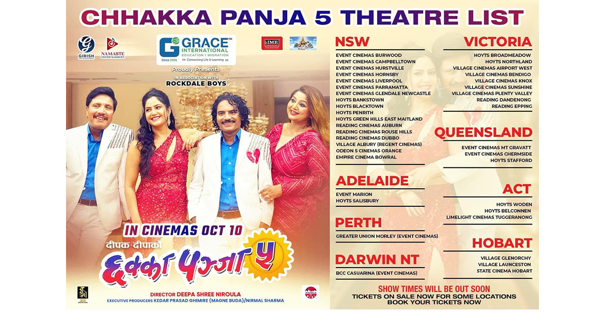अस्ट्रेलियामा रहेका नेपालीको सहजता र सुझावलाई ध्यानमा राखेर ‘छक्का पन्जा – ५’ बक्स अफिस रिलिज गर्न लागिएको फिल्मको अस्ट्रेलिया प्रदर्शनको जिम्मा पाएको नमस्ते इन्टरटेन्मेन्टले जनाएको छ।