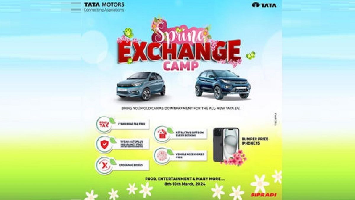 स्प्रिङ एक्सचेञ्ज कार्यक्रमका टाटाका गाडी किन्ने ग्राहकहरुले आकर्षक एक्सचेन्ज बोनस, १ वर्षको अटोप्लस इन्स्योरेन्स, १ वर्षको सवारी कर, एक्सेसरिज, हरेक बुकिङमा आकर्षक उपहार र बम्पर उपहारमा आइफोन १५ प्राप्त गर्नेछन्।