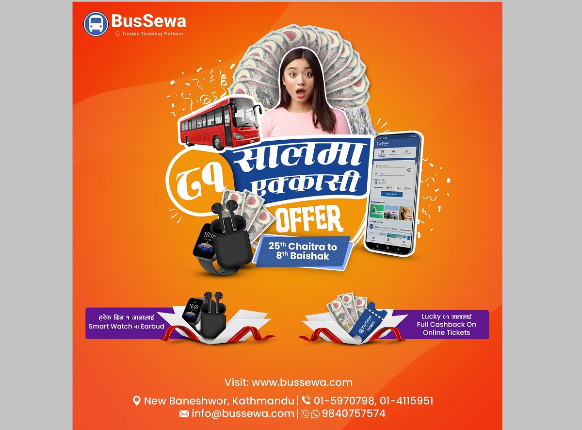 बस टिकेटिङ सेवा प्रदायक बससेवा डटकमले नयाँ वर्ष २०८१ सालको उपलक्ष्यमा ८१ सालमा एक्कासी अफर सार्वजनिक गरेको छ।
