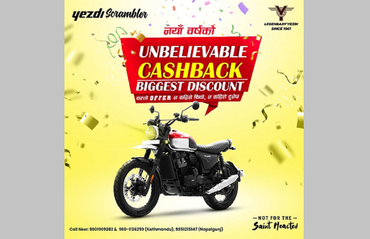 'हाम्रो साेरुममा आउने सबैले यज्डी स्क्रयाम्ब्लरलाई मनपराउनु भएको छ। उहाँहरूको यही उत्सुकतालाई साथ दिन हामीले नयाँ वर्षको अवसरमा यज्डी स्क्रयाम्ब्लरमा अविश्वसनीय क्याशब्याक र सबैभन्दा ठूलो छुट दिने योजना ल्याएको हौं,' अग्नि मोटोइंकका उपमहाप्रबन्धक प्रत्युश श्रेष्ठले भने।