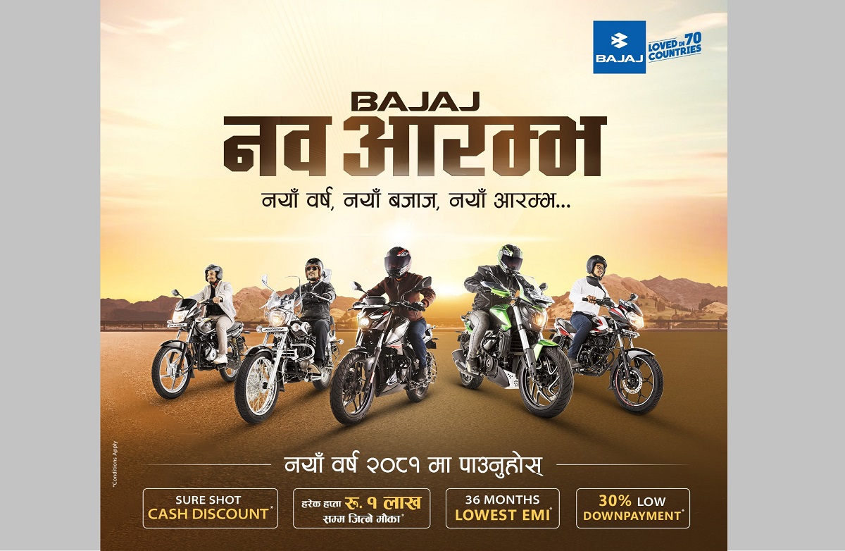 बजाजको 'नव आरम्भ' योजना अन्तर्गत ग्राहकहरूले बजाजका कुनै पनि बाइक किन्दा आकर्षक छुट पाउनेछन् भने भाग्यशाली विजेताहरूले १ लाख रूपैयाँसम्मको नगद उपहार पनि जित्न सक्नेछन्।