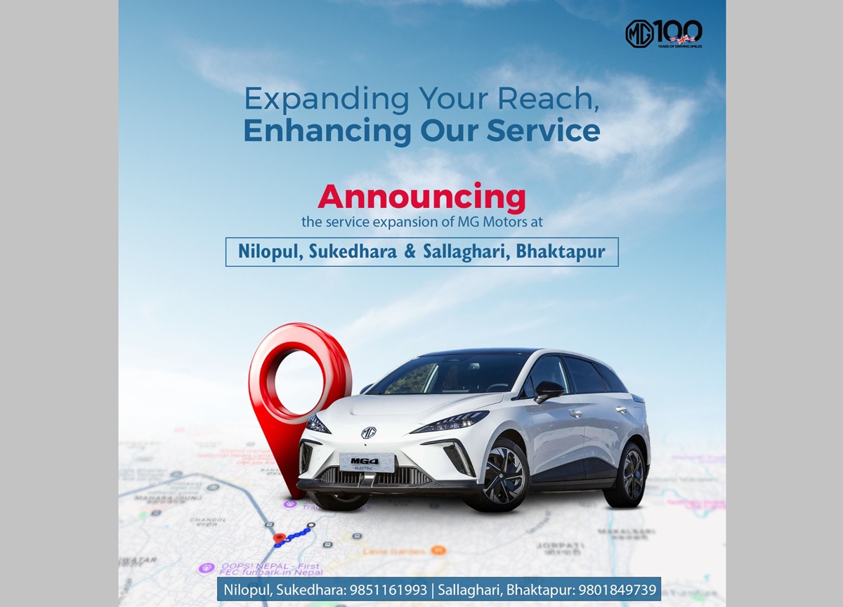 कुसुन्तीमा खोलेको पहिलो सेवा केन्द्रको सफलता पछिको कदमको रूपमा एमजी मोटर्स नेपालले मंगलबार सुकेधारा र सल्लाघारीमा थप सेवा केन्द्रहरू खोलेका छन्। यी केन्द्रहरूले साेही दिनदेखि आधिकारिक रूपमा आफ्नो सेवा प्रदान गर्न सुरू गरेका छन्।