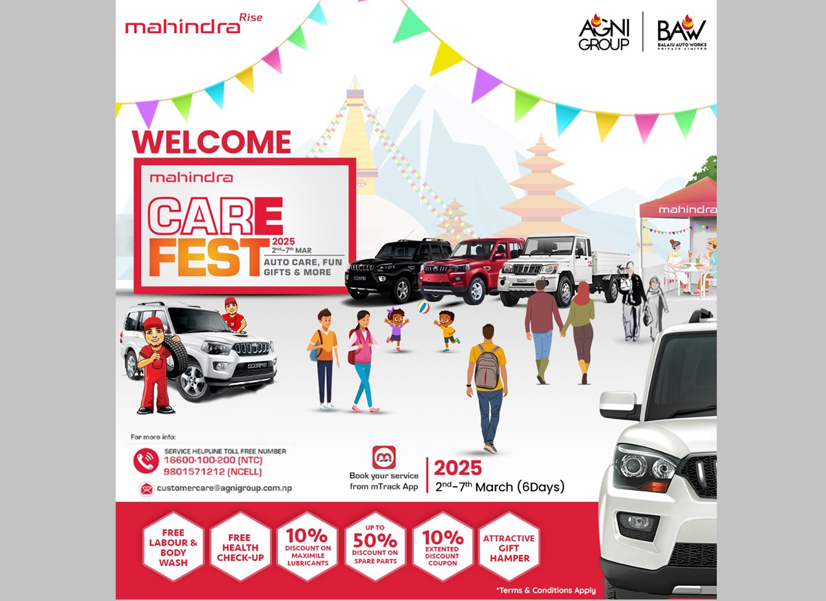 महिन्द्रा फोर ब्हिलरको नेपालका लागि अधिकृत बिक्रेता अग्नि ग्रुपको सहायक कम्पनी बालाजु अटो वर्कसले महिन्द्रा केयर फेस्ट आयोजना गर्ने भएको छ।