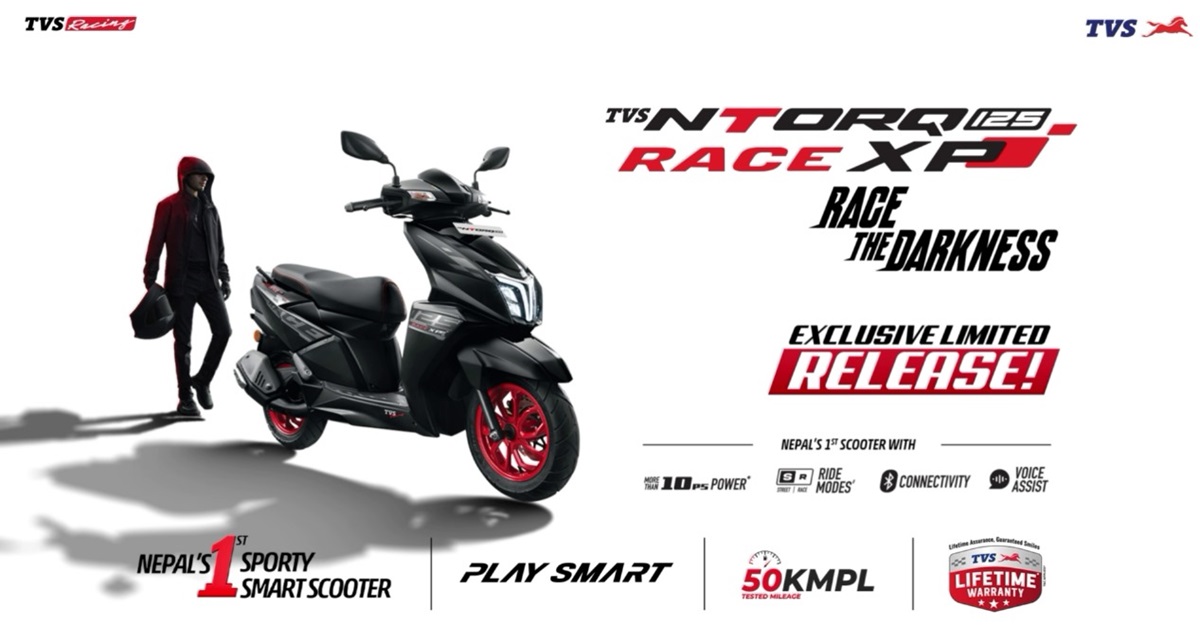 टिभिएस एनटर्ककोे नेपालका लागि आधिकारिक वितरक जगदम्बा मोटर्सले नयाँ एनटर्क रेस एक्सपी ब्ल्याक सार्वजनिक गरेको छ।