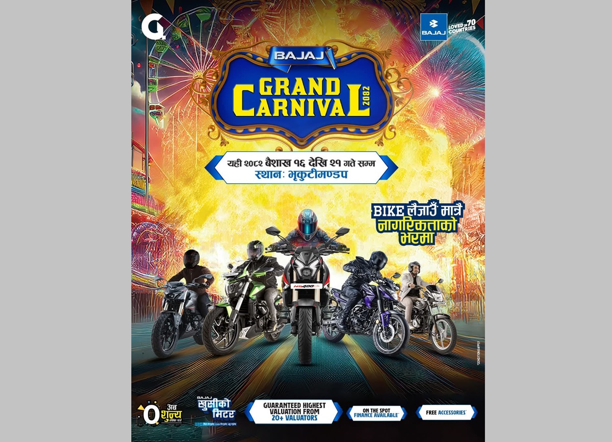 साथै, बजाज ग्रान्ड कार्निभल वैशाख १६ गतेदेखि वैशाख २१ गतेसम्म भृकुटीमण्डपमा चल्नेछ भने ग्राहकहरूको लागि गेम जोन, टेस्ट राइड पनि रहेको छ।