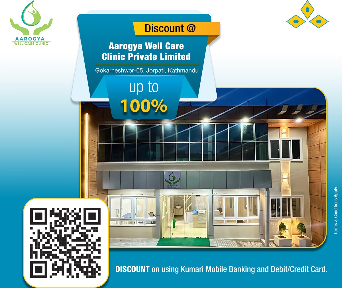 कुमारी बैंकका ग्राहकले आरोग्य वेल केयर क्लिनिकमा छुट पाउने भएका छन्।