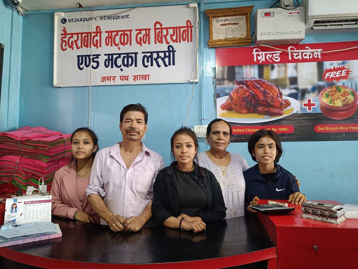'हैदराबादी मट्का दम बिरयानी' का दुई वटा होटलमा १४ जना कर्मचारी छन्। व्यवस्थापनको काम परिवारका सदस्यहरूले नै हेर्छन्। बजारतिरको काम जनकको जिम्मामा छ। भान्सा श्रीमती डिला खड्काले सम्हाल्छिन्। क्यास काउन्टर छोरीहरू चन्द्रिका र चन्द्राको हातमा छ।