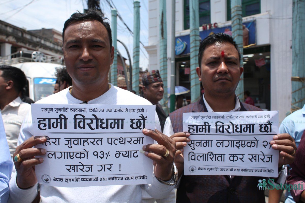 सरकारले सुन तथा गहनामा विलासिता कर लगाउन सुरू गरेपछि व्यवसायी त्यसको विरोधमा उत्रिएका हुन्। त्यस्तै, बहुमूल्य हिरा तथा पत्थरमा लगाइँदै आएको १३ प्रतिशत भ्याट पनि खारेज गर्न माग गरेका छन्।