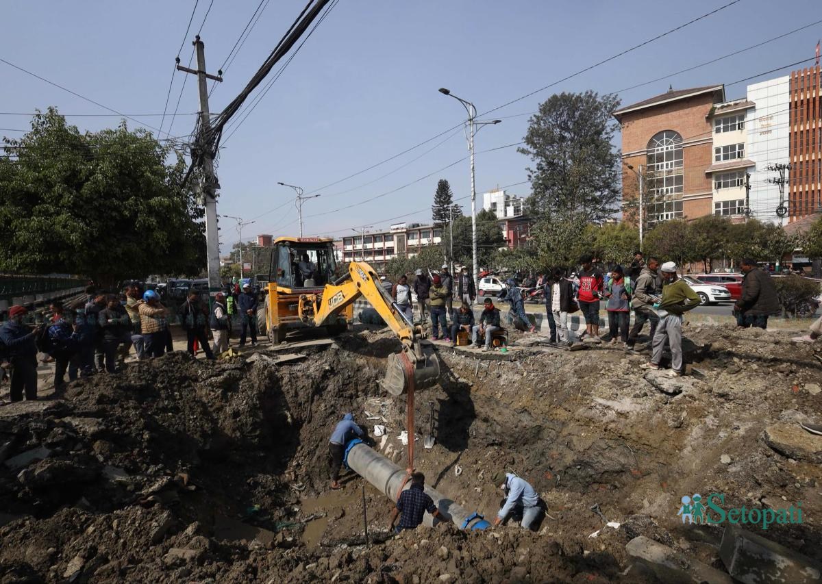 प्राधिकरणले त्यहाँ तार भूमिगत गर्न ड्रिल (सडक प्वाल पारेर तार बिछ्याउने) काम गरिरहेको छ। काठमाडौं महानगरले पनि फुटपाथ बनाइरहेको छ। दुवै निकायले सडक विभागसँग अनुमति लिएर काम थालेका थिए।