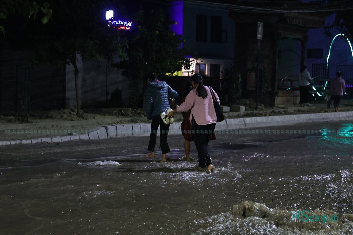 तीनकुनेमा फुट्यो खानेपानीको पाइप, सडक जलमग्न (तस्बिरहरू)