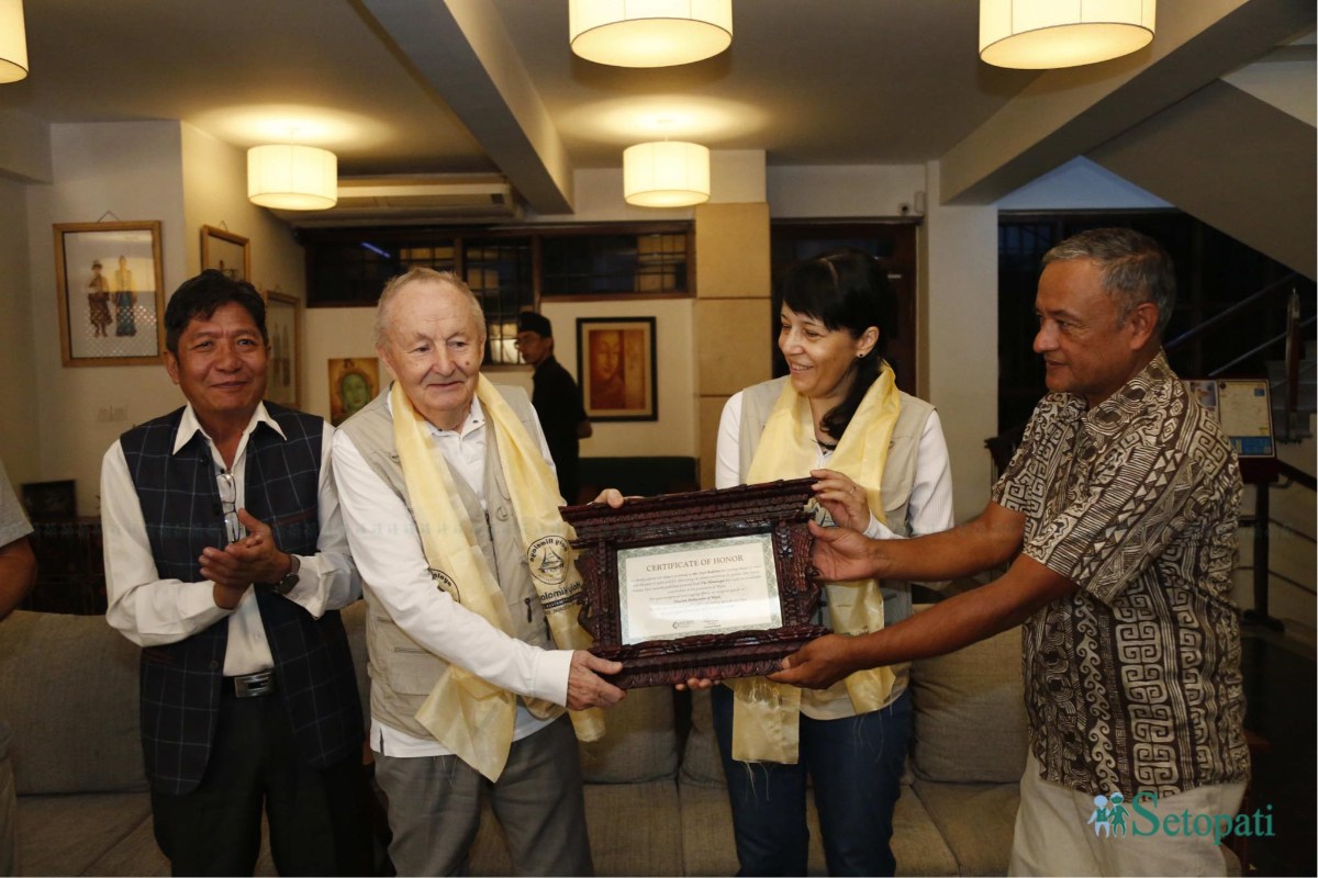 ठमेलको होटल होली हिमालयमा आयोजक संस्थाका सदस्य एवम् वातावरणविद् देवेन्द्र बस्न्यातले फोटोग्राफर रोडिचेभलाई सम्मानपत्र अर्पण गरेका थिए।