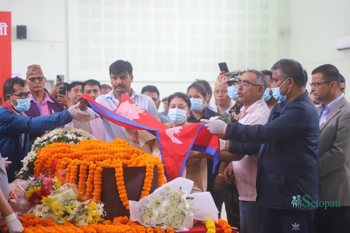 नेम्वाङको पार्थिव शरीरमा एमाले अध्यक्ष केपी शर्मा ओलीले पार्टीको झन्डा ओढाएर श्रद्धाञ्जली दिएका छन्।