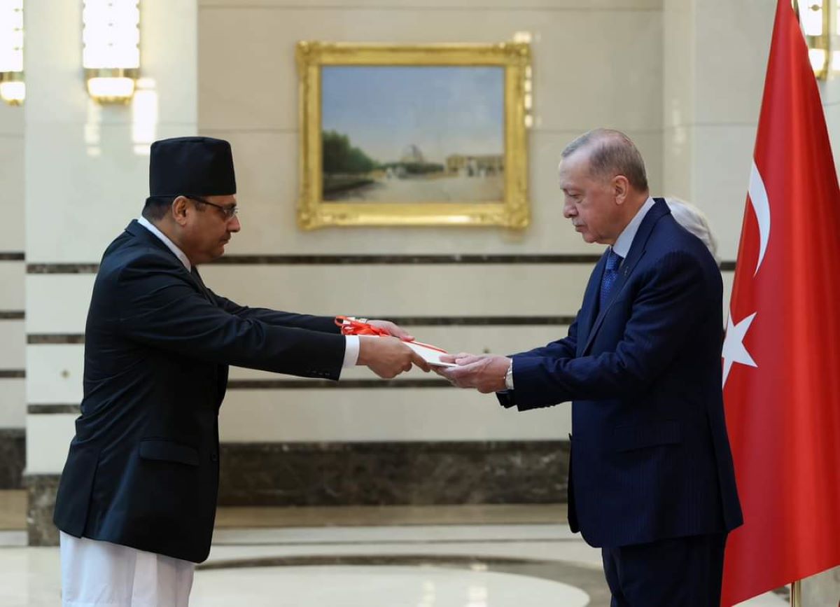 टर्कीका लागि नेपालका गैरआवासीय राजदूत तापस अधिकारीले त्यहाँका राष्ट्रपति तैयप एर्दोगानसमक्ष आफ्नो ओहोदाको प्रमाणपत्र प्रस्तुत गरेका छन्।