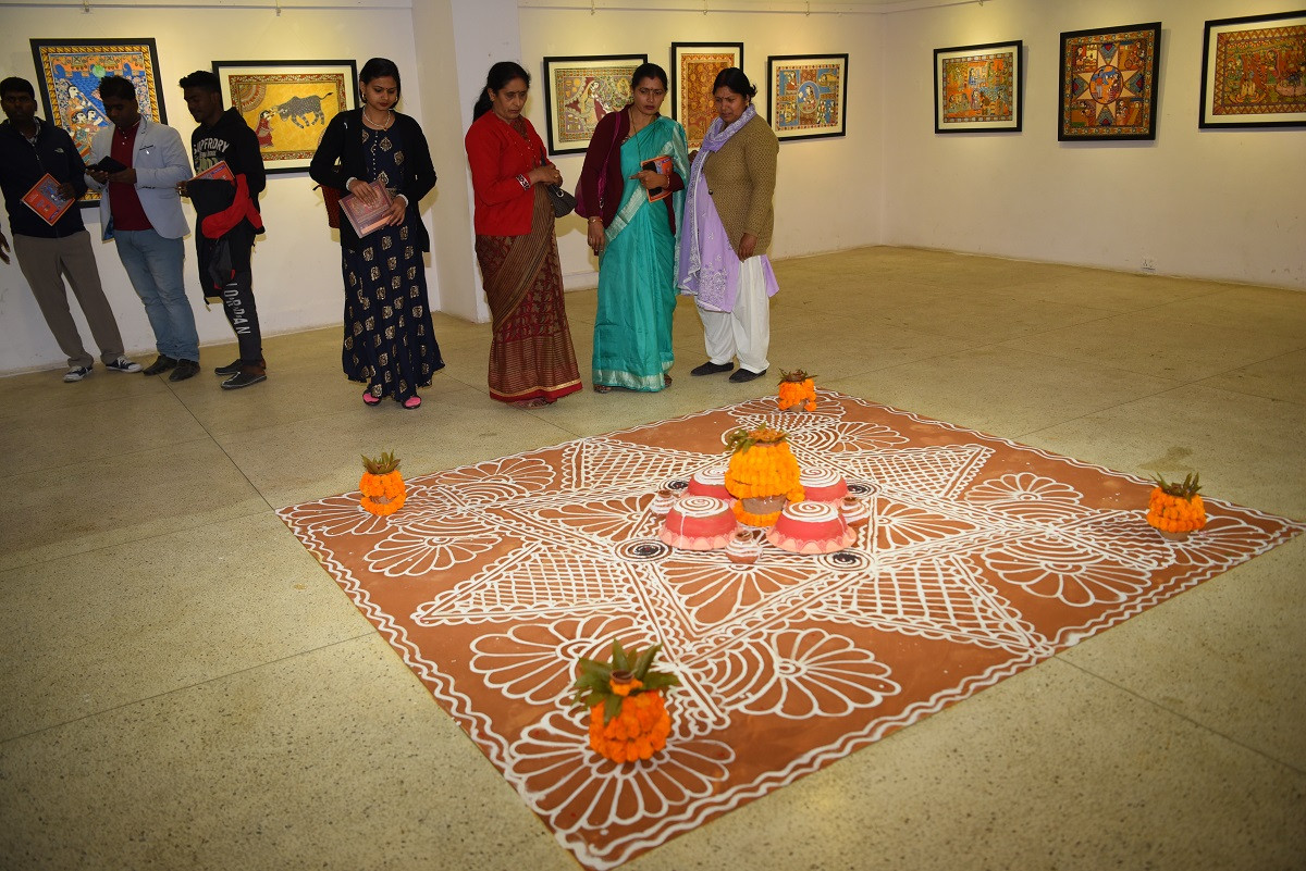 आफ्नो एकल चित्रकला प्रदर्शनीको बेला प्रदर्शनी कक्षको भुइँमा रन्जुले बनाएको चौक (अरिपन) चित्र।