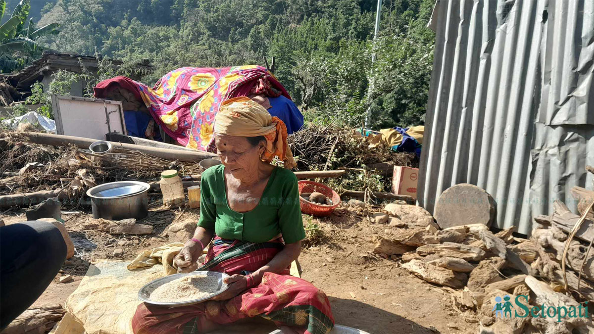 तत्काल भत्किएको घर छेउमा ढुंगाको चुलो बनाएर त्यसैमा खाना बनाउन थालेकी छिन्।