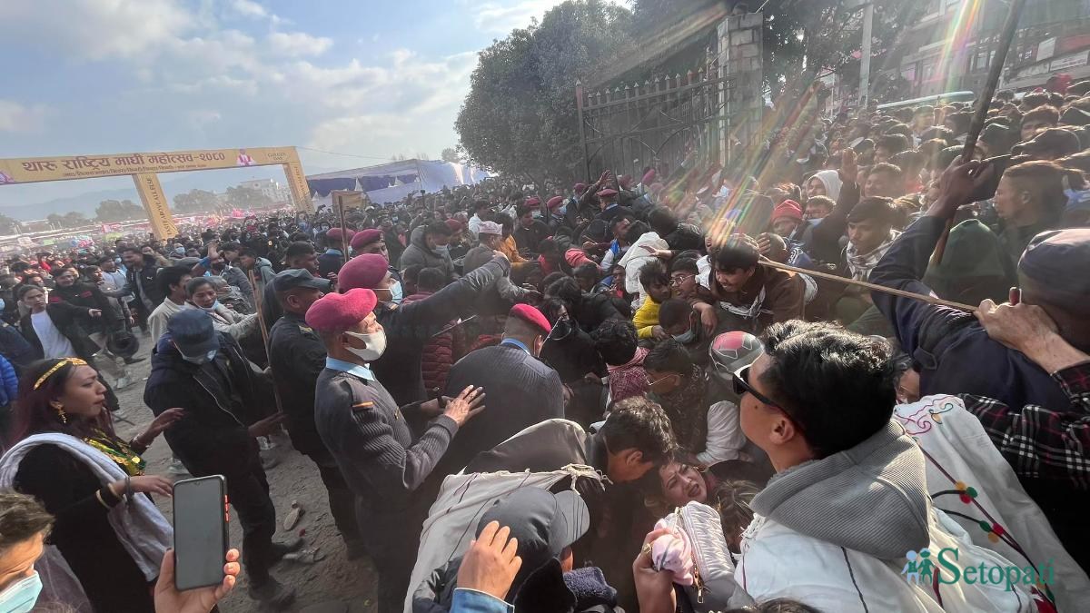 टुँडिखेलमा माघे सङ्क्रान्तिका अवसरमा मगर र थारू समुदायले आयोजना गरेको अलगअलग कार्यक्रममा सर्वसाधारणको अत्यधिक भीडका कारण चेपिएर १६ जना घाइते हुन पुगेका र उपचारपछि १५ जना घर फर्किएका काठमाडौं जिल्ला प्रहरी परिसरका प्रवक्ता तथा प्रहरी उपरीक्षक कुमोध ढुङ्गेलले जानकारी दिए।