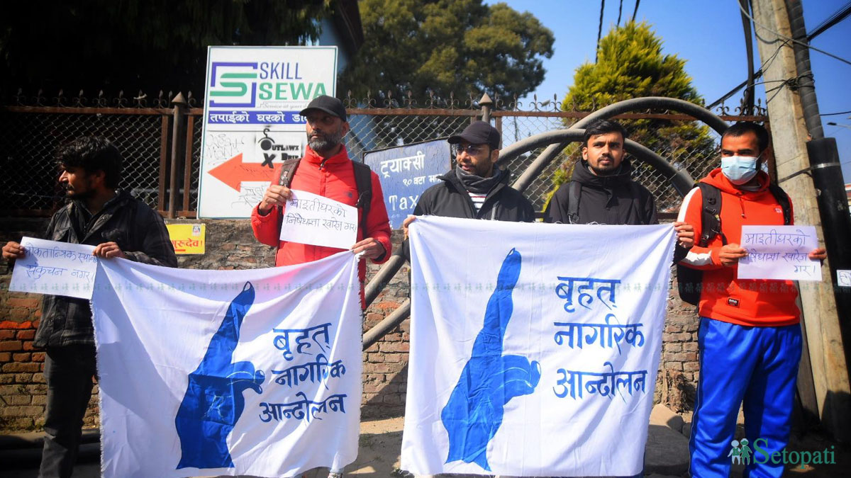 शनिबार बबरमहलस्थित नेपाल कला परिषद् भवन अगाडिको सडकमा बृहत नागरिक आन्दोलनका केही व्यक्तिहरूले प्लाकार्ड बोकेर लिएर प्रदर्शन गरेका हुन्।