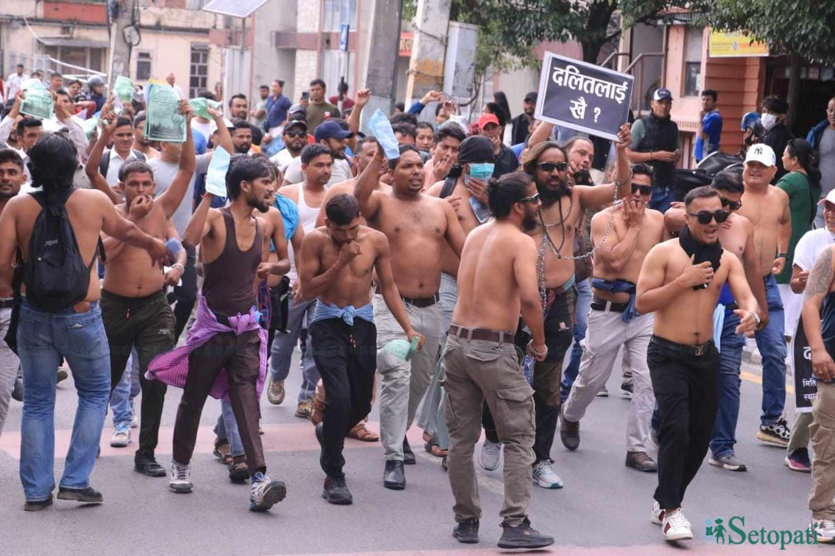 ‘दलितलाई खै’ अभियान चलाइरहेका खगेन्द्र सुनारसहितका युवाहरूले माइतीघरमा प्रदर्शन गरेका छन्।