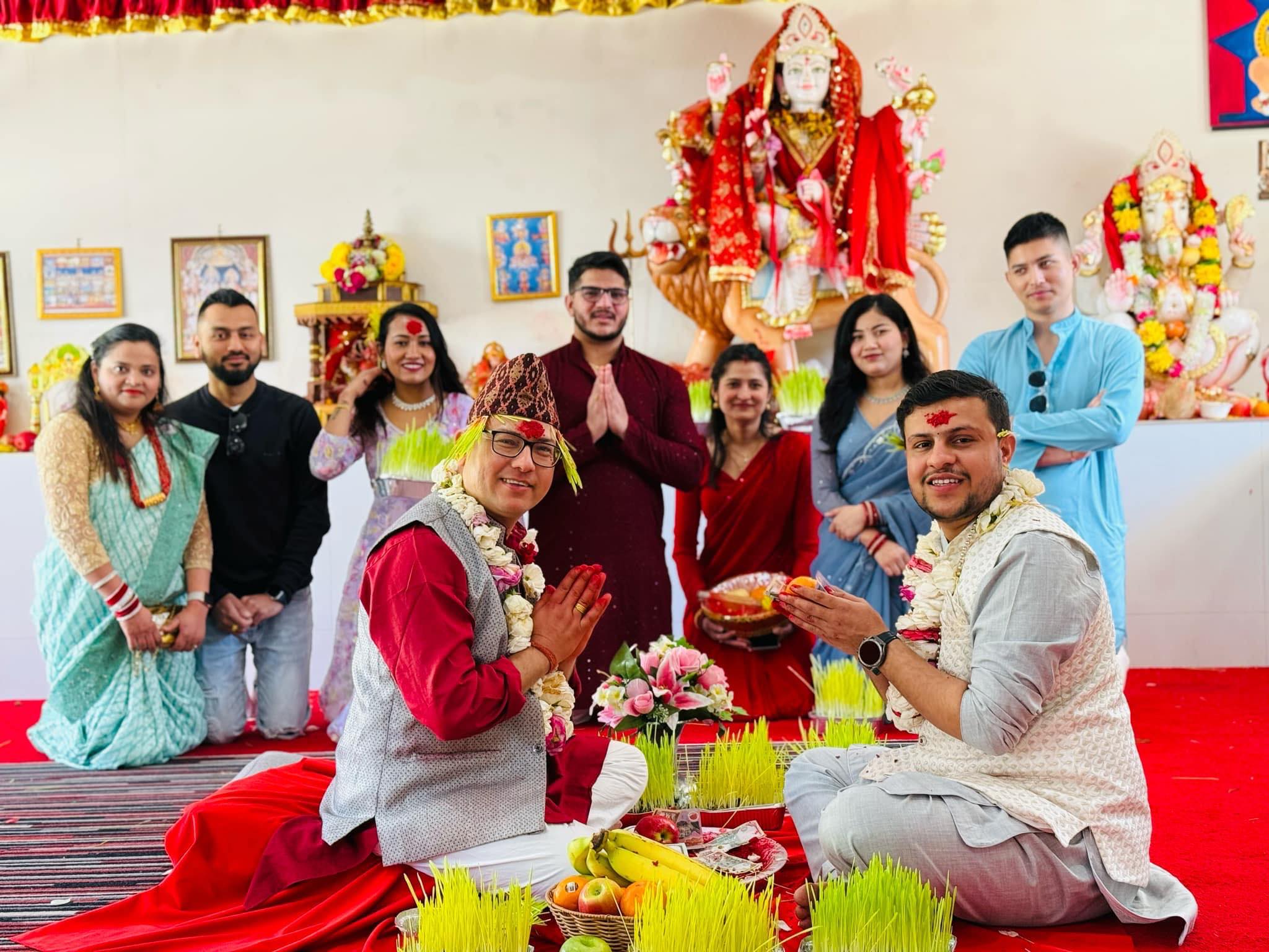 नेपाली समुदाय बिहानैदेखि जम्मा भएर उक्त मन्दिरका पुजारीसँग टीका लगाइरहेका छन्।