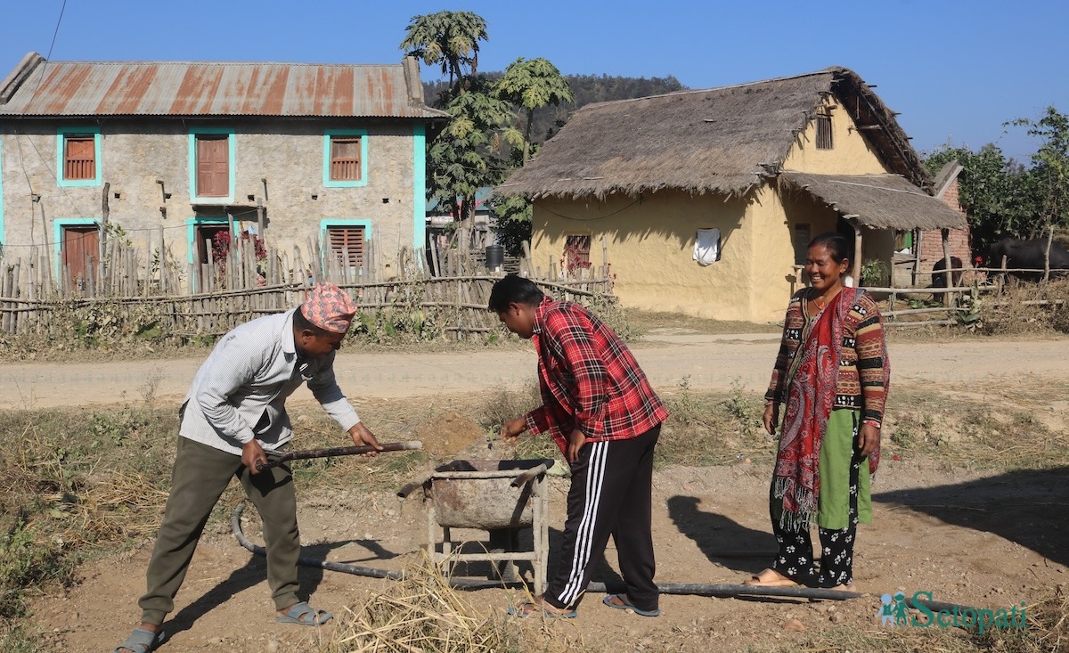 हामी पुग्दा चित्रबहादुर बेल्चाले गिटी-बालुवा उठाउँदै सानो ठेलागाडामा भरिरहेका थिए। नजिकै डोजरले नाला खनिरहेको थियो। माटोमा नमिसियोस् भनेर उनी गिटी-बालुवा सार्दै थिए।