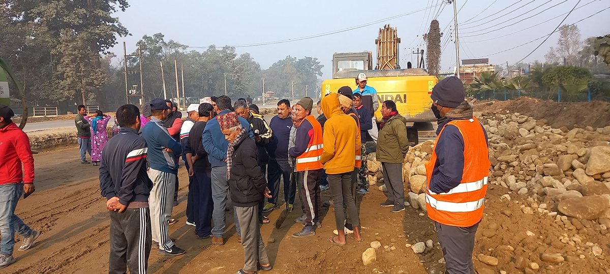 ‘आज बिहान केही स्थानीयहरू आउनु भएको थियो, उहाँहरूले सडकको नालीको पानी सुखौरा खोलामा लैजाने गरी भएको डिजाइन परिवर्तन नगरेसम्म काम गर्न दिन्नौं भनेर अवरोध गरेपछि हामीले काम बन्द गर्न बाध्य भएका छौं,’ मिश्रले भने।
