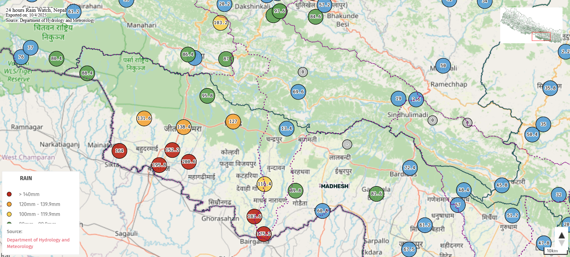 पर्सामा १९५.८, रौतहटको महेशपुरमा १८३.६, गौरमा १७५.२, परवानीपुरमा १५२.२ मिलिमिटर वर्षा भएको छ।