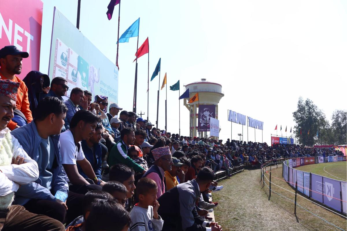 खेल हेर्न मैदानको चारैतिर दर्शकहरूको बाक्लो उपस्थिती छ।