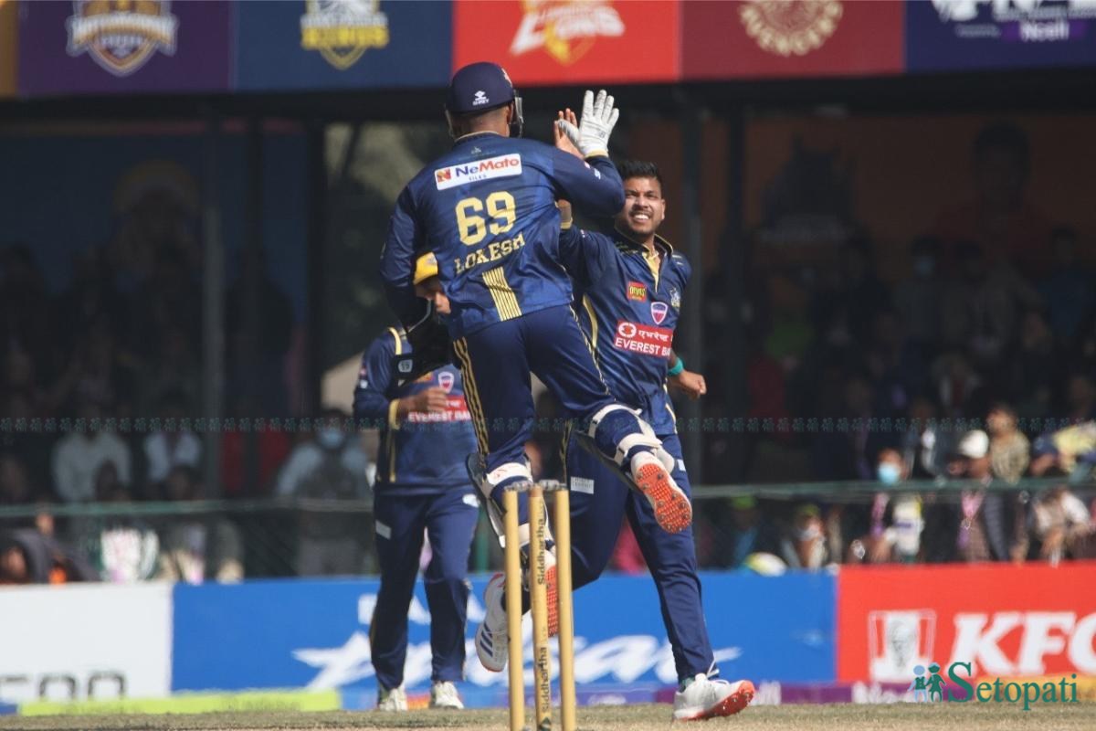 बलिङतर्फ पोखराका धनन्जय लक्ष्यनले ३ विकेट लिए। विपिन खत्री, रोहित चन्द र किरण ठगुन्नाले एक/एक विकेट लिए।