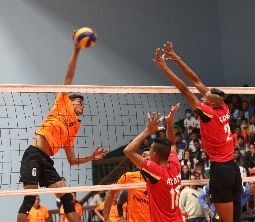 त्रिपुरेश्वरस्थित राष्ट्रिय खेलकुद परिषद्को कभर्डहलमा भएको प्रतिस्पर्धात्मक पहिलो सेमिफाइनलमा दुई सेटले पछि परेको स्थितिलाई उल्ट्याउदै एपीएफले अर्को विभागीय टोली नेपाल आर्मीलाई ३–२ ले पराजित गर्यो।